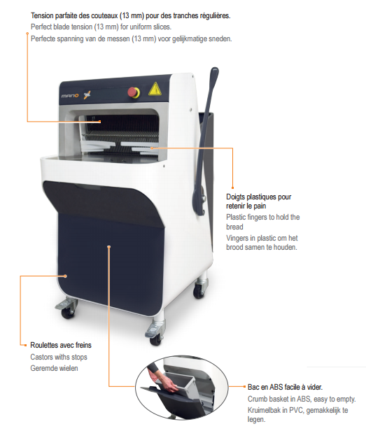-Sinmag vous présente sa large gamme des trancheuses à pain avec un Design innovant et élégant. Levier à traction progressive. Très silencieuse. Tension parfaite des couteaux (13 mm) pour des tranches régulières. menée des Roulettes avec freins, Doigts plastiques pour retenir le pain et un Bac en ABS facile à vider.