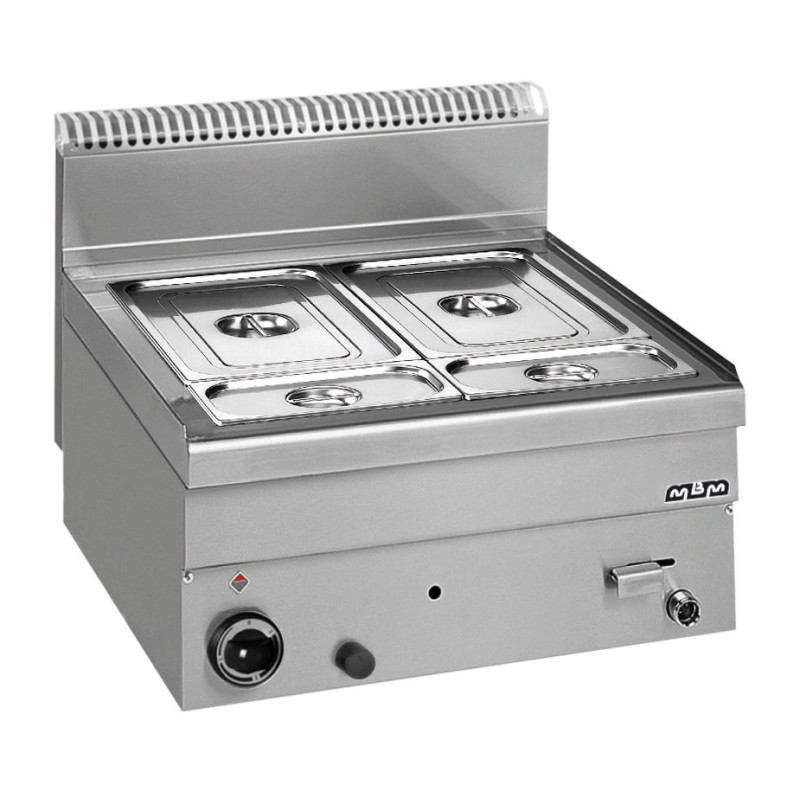 Vidange en façade avec robinet sphérique. Cuve en acier inoxidable. Capacité cuve gastronorme h 150mm,1/2+1/3 pour EBM/GBM46, 1/1+1/4+1/4 pour EBM/GBM66 Chauffage Gaz: Brûleur en acier inoxydable avec flamme auto-stabilisée. Réglage thermostatique de la température avec sécurité par thermocouple. Allumage automatique avec veilleuse et piezzo-électrique. Chauffage Electrique: Résistance en acier inoxydable. Réglage thermostatique de la température avec voyant de contrôle du fonctionnement et de la température.