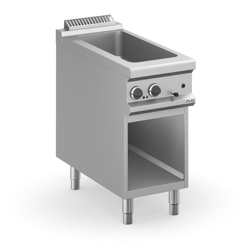 La cuve en acier inoxydable AISI 304 est moulée et soudée. Le chauffage électrique est avec resistances de chauffe en acier blindé situées sous la cuve et est contrôlée par thermostat. Plan de travail en acier inoxydable AISI 18/10 épaisseur 1 mm. Alignement de modules par juxtaposition.