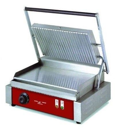 Appareil à panini série PRO 2 modèles standards: conçut en acier inox 18/10 AISI 304, mené d'une Plaque fonte spéciale traitée avec un émail alimentaire vitrifié, un thermostat réglable de 50 à 250°C avec contrôle du voyant lumineux pour les indications. Cet appareil possède une résistance blindée anti-corrosion et un très bon conducteur de chaleur aussi qu'une suspension des plaques supérieures d’une grande maniabilité.