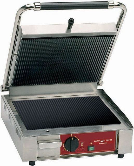 Appareil à panini 'VITROCERAMIQUE' ELECTRO BROCHE Idéal pour les snacks à haut débit, le contact grill vitrocéramique assure une cuisson rapide, saine et propre à infrarouge par le transfert direct et uniforme sur toute la surface pour une cuisson à cœur du produit avec conservation des saveurs. Sa plaque supérieure contre-balancée adaptée à la hauteur désirée de cuisson. Cet appareil est connu par son utilisation très sécurisée, un système de levier pour un usage continu son entretien facile, son tiroir d’évacuation des graisses, et ses plaques vitrocéramiques.