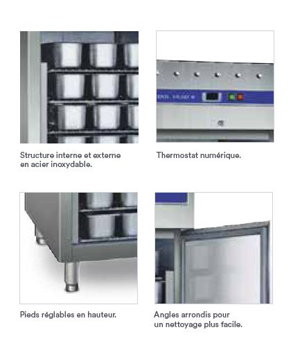 • Armoire professionnelle avec structure interne et externe en acier inoxydable pour application chez les glaciers,avec possibilité de contenir jusqu'à 60 bacs de 5 litres (bacs non inclus).