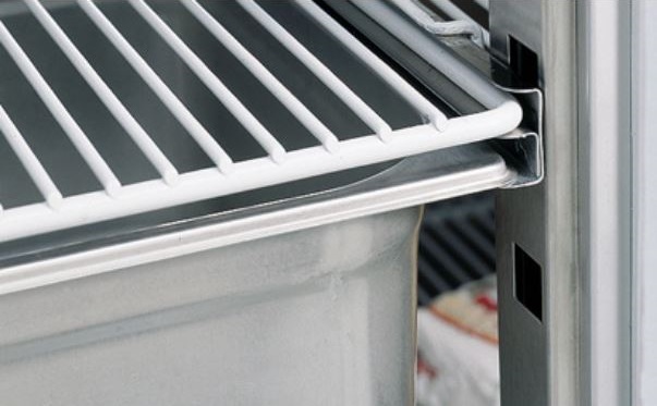 -Des glissières en E qui permettent d’empiler des bacs GN 2/1 insérés de manière transversale sous les rayons.