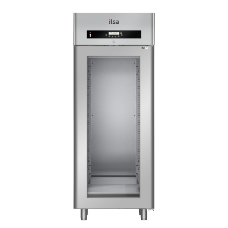 Structure monobloc en acier inox ; finition extérieure satinée scotch-brite ; épaisseur d'isolation de 75 mm avec mousse de polyuréthane à haute densité (40 kg/m3) ; pieds réglables en acier inox h. 120-150 ; chambre froide avec angles internes arrondis pour faciliter le nettoyage ; crémaillères et glissières en acier inox pour plaques 60×80 ; dégivrage automatique par gaz chauds et évaporation de l'eau de condensation ; portes à fermeture automatique avec arrêt à 100° ; groupe frigorifique monobloc breveté ; flux d'air externe et interne optimisés ; design élégamment arrondi ; éclairage interne ; serrure de série ; carte électronique INTELLI avec écran LCD à cristaux liquides qui permet de contrôler les paramètres conformément aux normes HACCP. Programme spécifique pour le chocolat avec consigne +14°C. Plage de fonctionnement +4°C +18°C.