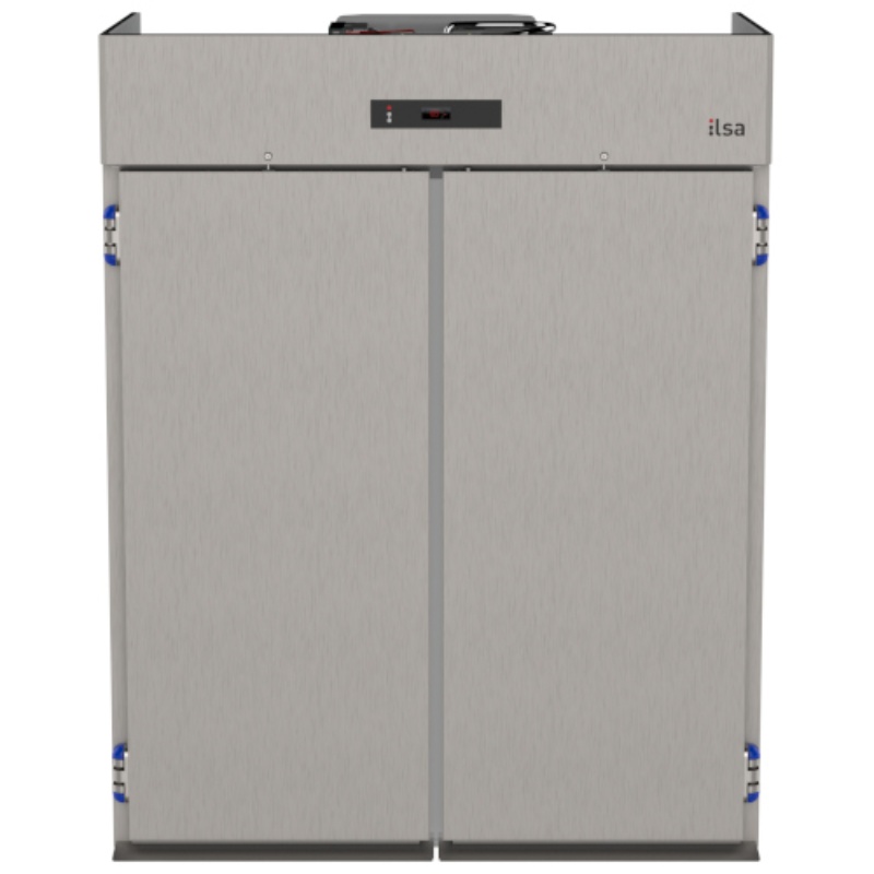 Structure monocoque en acier inox AISI 304 ; finition extérieure satinée scotch-brite ; épaisseur d'isolation de 80 mm, avec mousse haute densité sans HFC (40 kg/m3) ; dégivrage par gaz chauds et évaporation de l'eau de condensation ; sol en acier inox fourni de série dans tous les modèles ; disponible avec portes pleines ou vitrées ; éclairage intérieur de série dans les modèles avec portes vitrées ; version passante disponible ; tous les modèles permettent l'insertion de chariots h max. 183cm ; le modèle à une porte permet l'insertion d'un chariot GN 2/1 ou d'un chariot 60×80 ; le modèle à deux portes permet l'insertion de deux chariots GN 2/1 ou de deux chariots 60×80 ; optimisation des flux d'air internes et externes ; fermeture automatique des portes à 100° ; groupe frigorifique monobloc tropicalisé breveté (en classe climatique 5) ; serrure de série ; alimentation électrique monophasée 230V/50Hz.