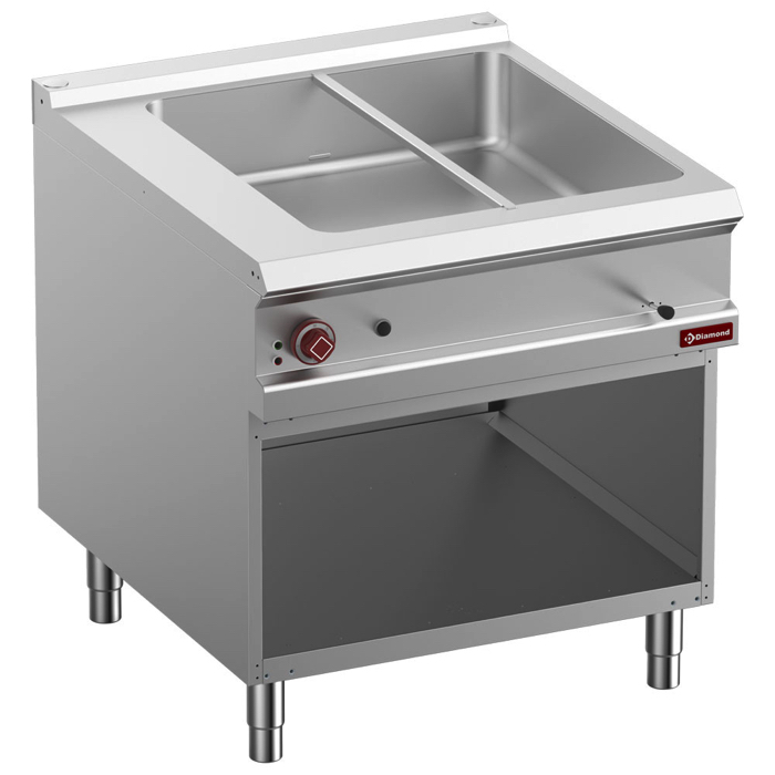 Cheminée arrière en acier inox AISI 304. Cuve 'emboutie' en acier inox AISI 304 soudée (en continu), avec tous les coins et angles intérieurs arrondis pour un entretien facile et hygiénique, un robinet de vidange (à bille) et de remplissage (électrovanne) de la cuve sont placés sur la face avant de l'appareil. Chauffage électrique par résistances blindées en acier inox, placées en dessous du fond de la cuve, à l'extérieur. Régulation de 30°C à 90°C, accessibilité frontale permettant une maintenance très aisée.