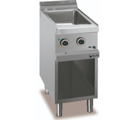 Le plan de travail est réalisé en acier inoxydable AISI304 d'une épaisseur de 1 mm. Les cuves possèdent une capacité GN4/3 pour le module largeur 40 cm et GN8/3 pour le module largeur 80 cm. La resistance de chauffe en acier blindé est située sous la cuve et est contrôlée par thermostat.