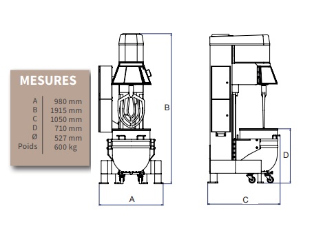 Les pieds sont en inox. Il y'a une sécurité présence, montée et descente de la cuve.