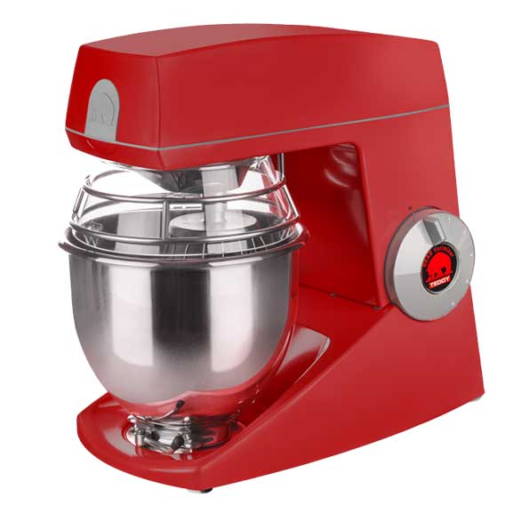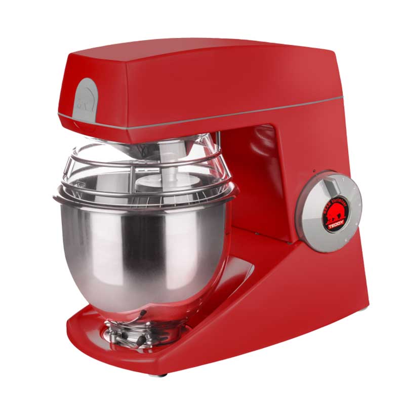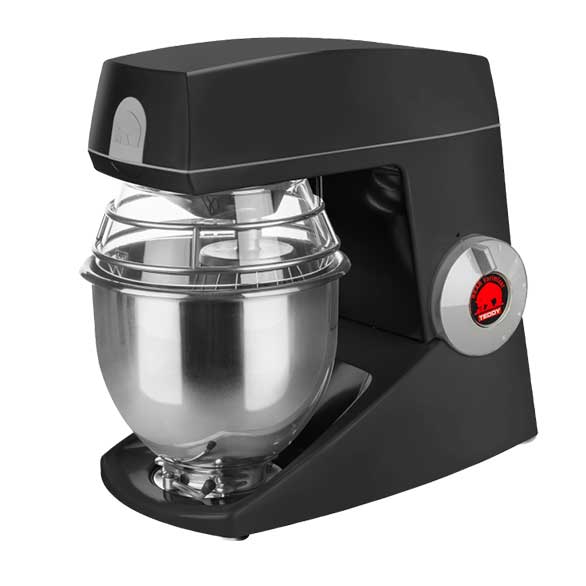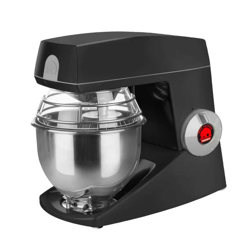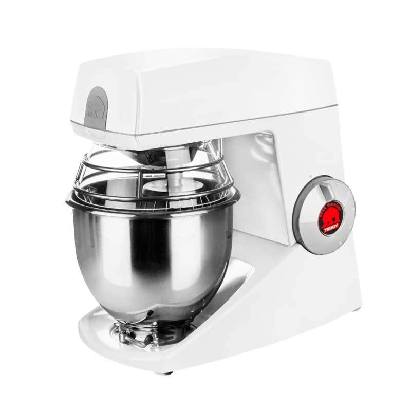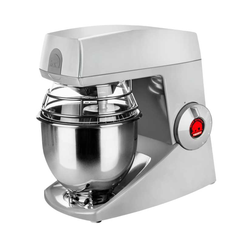 - TEDDY est livré avec écran de sécurité fixe, bol, crochet, fouet et palette en acier inoxydable ainsi qu’avec un plateau de remplissage et couvercle en plastique pour le bol