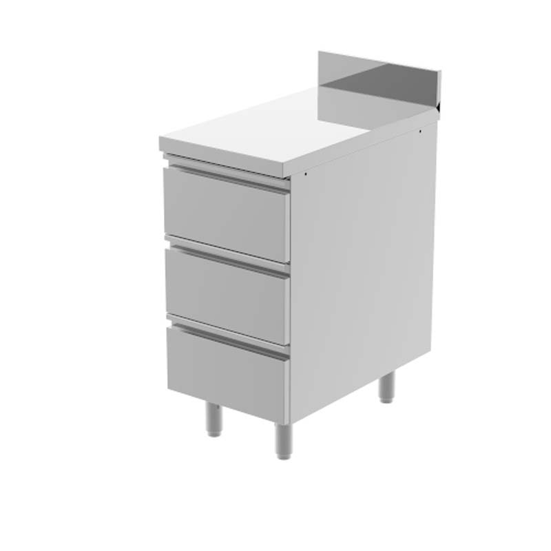 Typology : avec 3 tiroirs Dimensions (mm) : 400 x 700 x 850 mm Plan de travail en acier avec dosseret de 40 mm d'épaisseur Avec 3 tiroirs