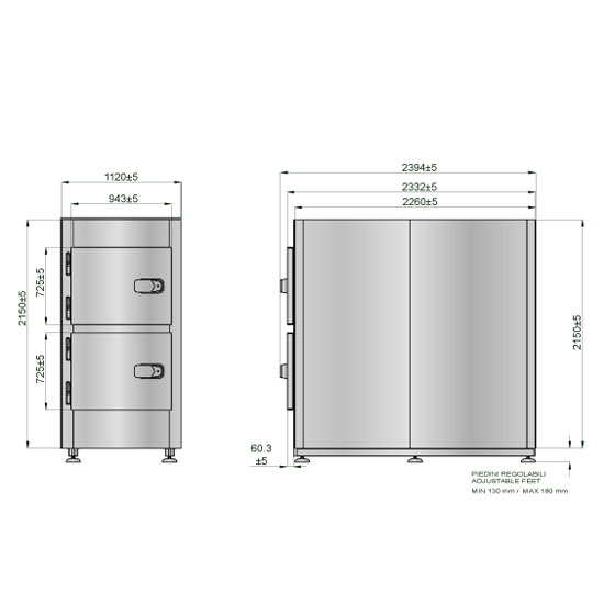 - Dimensions extérieures (LxPxH) : 1120 x 2260 x 2150 mm, idéales pour une intégration efficace dans divers