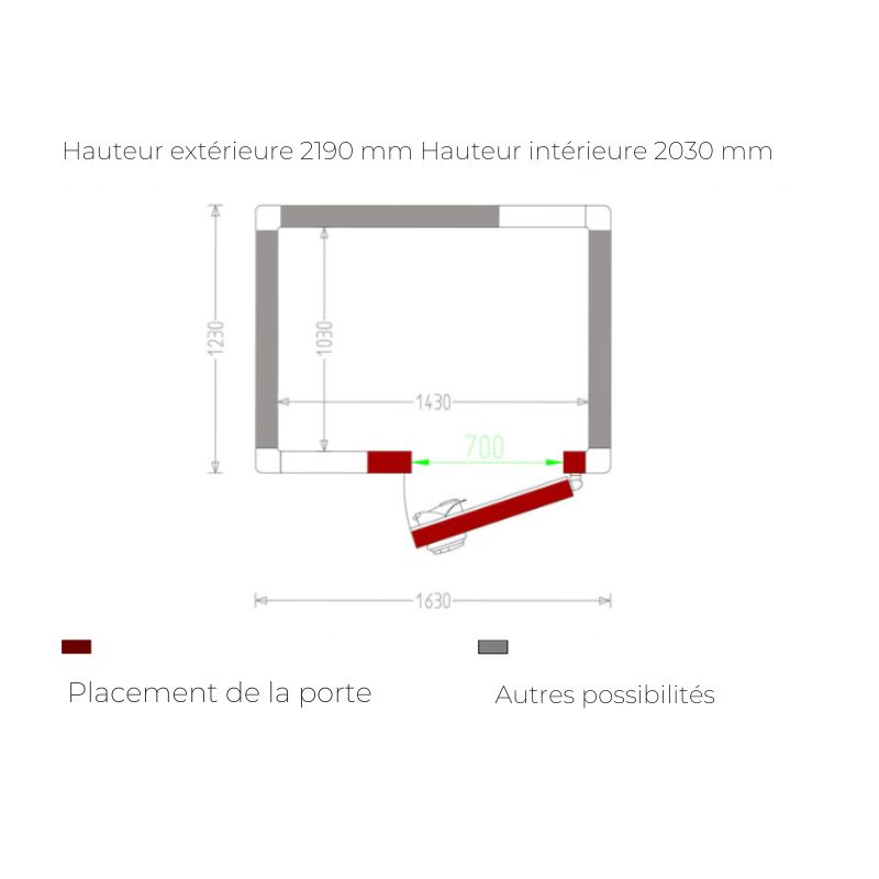- Porte, passage utile 700xh1900 mm (positionnement de la porte au choix, sur les 4 côtés).