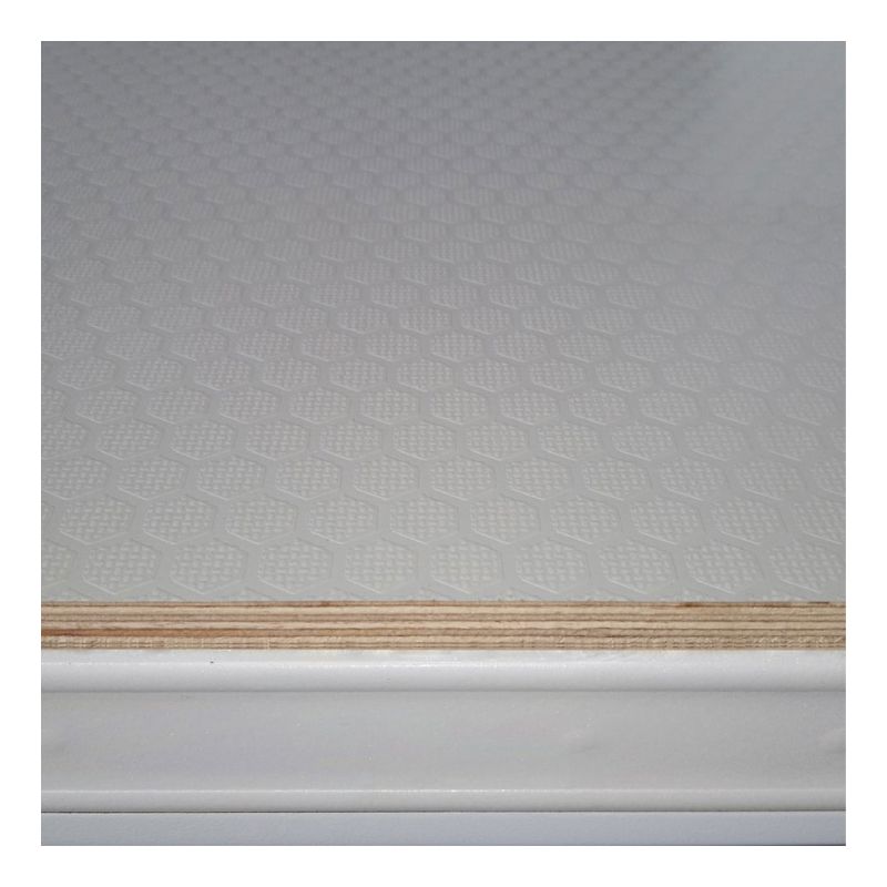 - Sol renforcé en bois multiplex 12mm, recouvert d’une résine phénolique antidérapante 'alvéolée', supportant une charge de 4000 kg/m² (140kg de charge ponctuelle).
