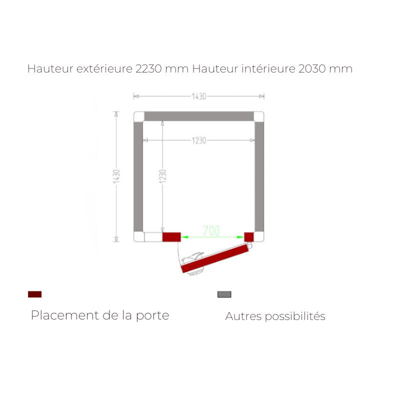 - Porte, passage utile 700xh1900 mm (positionnement de la porte au choix, sur les 4 côtés).