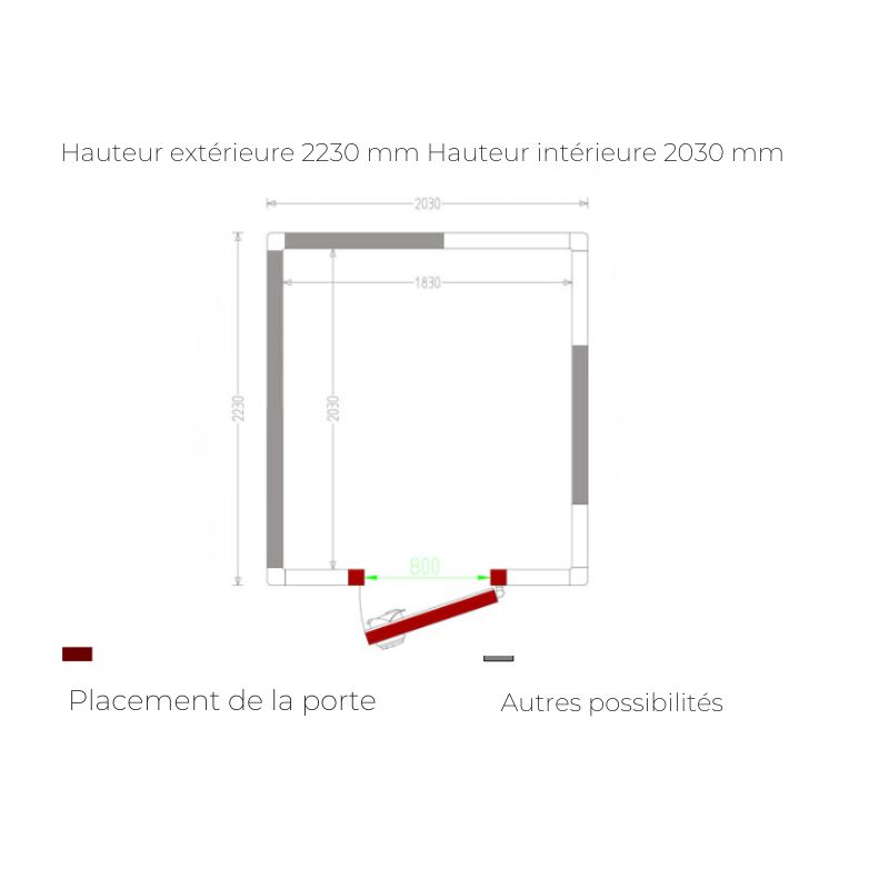- Porte passage utile 800xh1900 mm (positionnement de la porte au choix, sur les 4 côtés).