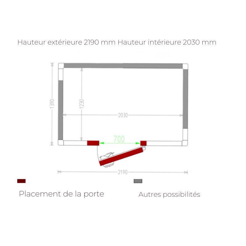 - Porte, passage utile 700xh1900 mm (positionnement de la porte au choix, sur les 4 côtés).