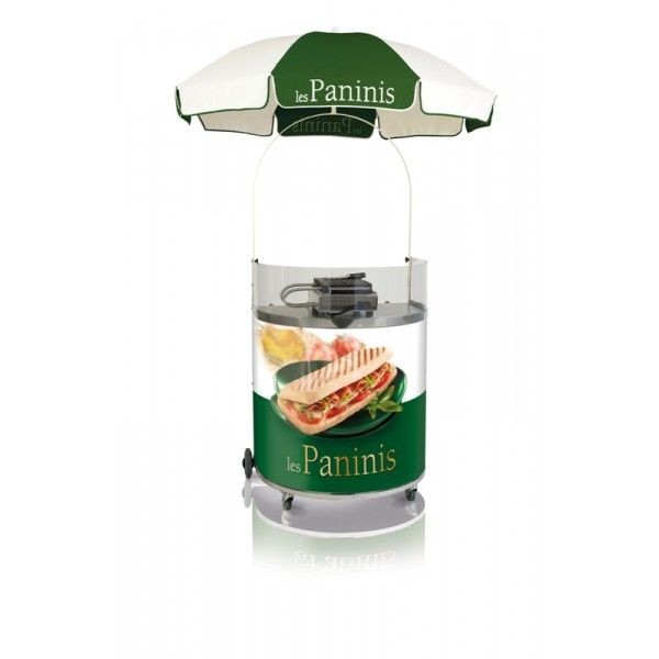 Découvrez les chariots demi-lune paninis Krampouz d'une hauteur de plexiglas: 1170 mm et avec parasol de: 2230 mm avec une largeur avec les roues de :980mm et une profondeur de 730mm, habillé en inox avec décor en impression numérique avec film de protection anti-graffiti disponible en couleur verte (version panini) ou à personnaliser, conçu pour l'utilisation à l'intérieur ou à l'extérieur, mené d'un plan de travail en inox avec un parasol bicolore avec inscription montée sur un arceau démontable, 2 poignées de manœuvre, une tablette intérieure de rangement, 4 roues dont 2 directionnelles avec frein pour maintenir la sécurité de déplacement du chariot, emplacement pour bouteille de gaz, et des accessoires de support des crêpières. Ces chariots peuvent être utilisés en intérieur ou en extérieur: terrasse, trottoir, marché, camping... Avec une protection plexiglas d'une hauteur de 25 cm et ils sont très faciles à nettoyer. Toutes nos versions de chariots Krampouz sont personnalisables