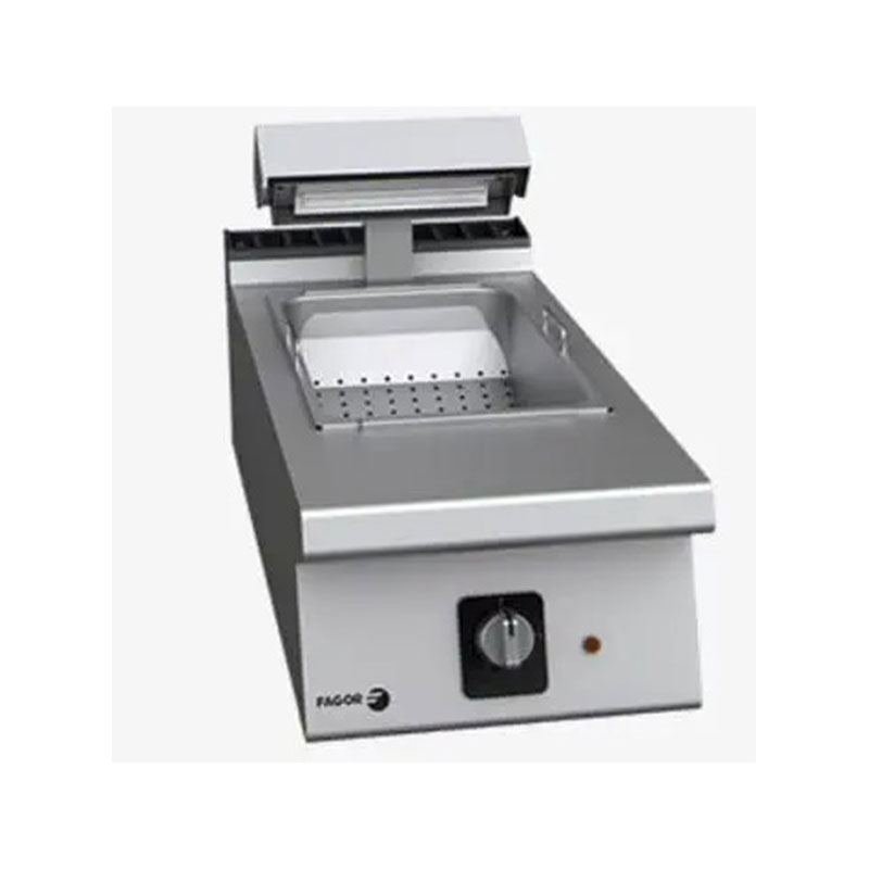 - Double fond perforé fabriqué en acier inoxydable, avec inclinaison pour éliminer l’excès d’huile de friture et sa récuperation dans le récipient.
