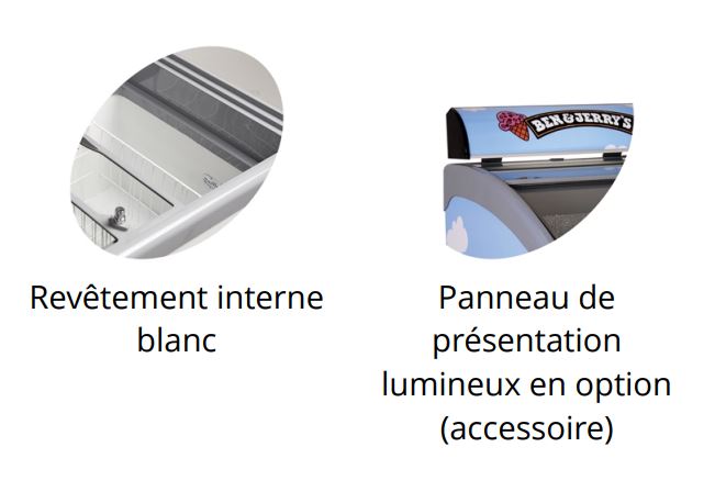 -Ce congélateur est idéal pour présenter des aliments surgelés comme les glaces et bâtonnets glacés. Il est possible de maintenir une température de -14 °C pour les glaces et de -21 °C pour les autres aliments surgelés.