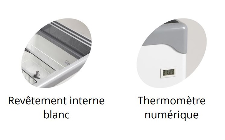 -Ce congélateur est idéal pour présenter des aliments surgelés comme les glaces et bâtonnets glacés. Il est possible de maintenir une température de -14 °C pour les glaces et de -21 °C pour les autres aliments surgelés.