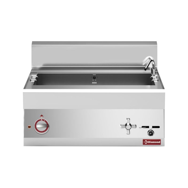 - Cuve en acier inox AISI 316, épaisseur 15/10 ème, résistant à la corrosion du sel et à l’usure, munie d’un trop plein pour les amidons. La vanne du robinet d’eau pour le remplissage de la cuve ainsi que la vanne de décharge (à bille) sont placées sur la face avant de l’appareil. L'intérieur de cuve est muni d’un double fond perforé en inox AISI 304 qui protège les résistances d'un contact éventuel avec les paniers.