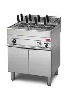 -Cuve en acier inox AISI 316, épaisseur 15/10 ème, résistant à la corrosion du sel et à l’usure, munie d’un trop plein pour les amidons. La vanne du robinet d’eau pour le remplissage de la cuve ainsi que la vanne de décharge (à bille) sont placées sur la face avant de l’appareil. L'intérieur de cuve est muni d’un double fond perforé en inox AISI 304 qui protège les résistances d'un contact éventuel avec les paniers.