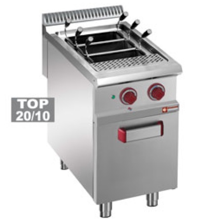 Cuiseur polyvalent pour pâtes, riz, légumes, oeufs, ,,,,, Le TOP spécialement embouti et l'égouttoir perforé spécialement conçu, permettrons d'égoutter les divers paniers à pâtes, ainsi que de contenir les éventuels débordement de l'eau. La cuve est réalisée en acier inox AISI 316 (résistant à la corrosion du sel et à l'usure), complètement soudée (en continu), elle est munie de série d'un filtre à la sortie de la décharge et d'un deuxième filtre à l'évacuation du trop-plein, de manière à retenir les pâtes tombées dans l'eau de cuisson, évitant ainsi de boucher les canalisations. Sur demande: couvercle pour cuve, permettant une ébullition de l'eau plus rapide!!.... ainsi que de nombreux paniers spécifiques.
