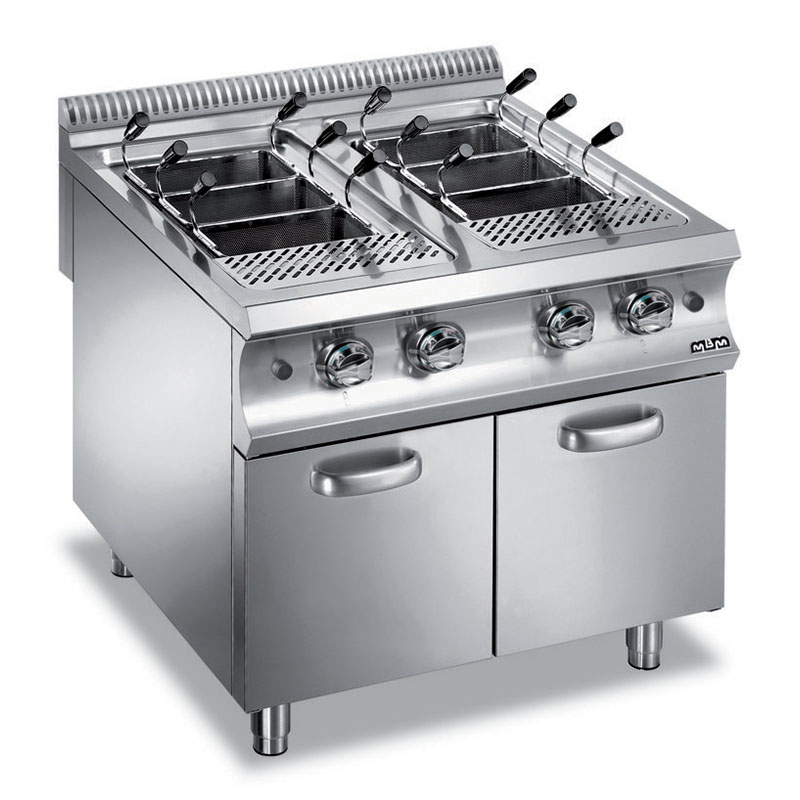 MBM vous propose une large gamme de cuiseurs à pâtes. Le plan de travail emboutit est réalisé en acier inoxydable AISI304, il possède des angles arrondis pour la récupération des liquides. Les cuves sont réalisées en acier inoxydable anti corrosion AISI316, et possèdent une zone de trop plein permettant dévacuer les amidons. Les angles sont arrondis pour faciliter le nettoyage, La grille dégouttage permet de déposer le panier de cuisson. Les paniers (option) sont réalisés en acier inoxydable AISI304 et sont équipés de poignées anti-chaleur. Version gaz: Brûleur acier à flamme stabilisée. Thermocouple et vanne de sécurité. Allumage piezzo. Version électrique: résistances chauffantes blindées, réglage de la chauffe avec contacteur 4 positions et thermostat de sécurité.