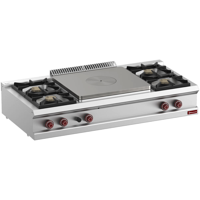 Brûleurs à feux vifs en fonte traitée étanche, couronne en laiton (à très haut rendement). Régulation par une vanne gaz. Régulation des bruleurs de 1,5 à 7 kW par vanne gaz, allumage par veilleuse et sécurité par thermocouple, accessibilité frontale permettant une maintenance très aisée.