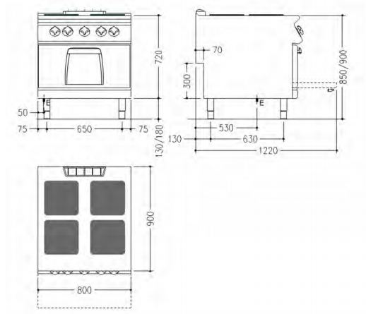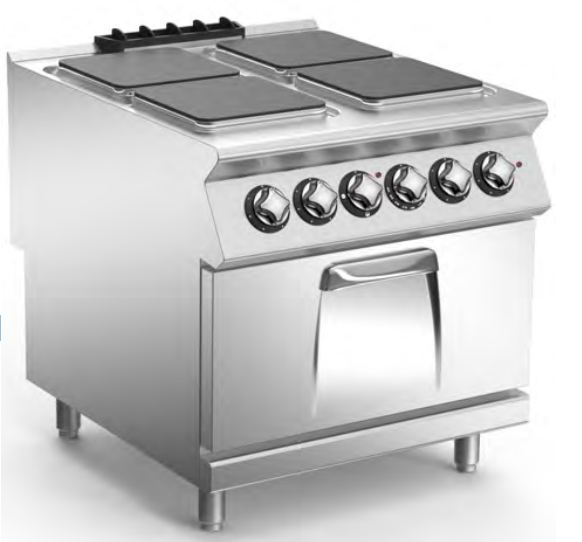 Cuisinière monobloc électrique avec four électrique, réalisée en acier inox AISI 304. Plan de cuisson électrique réalisé en acier inox AISI 304. Plan embouti épaisseur 20/10, concu pour l'assemblage aux extrémités et le montage de l'accessoire colonne d'eau. Plan avec canal pour la récupération des liquides. Plaques chauffantes carrées 300x300 mm en fonte, 4 de 4 kW chacune, fixées hermétiquement au plan. Plaques dotées d'un thermostat de sécurité à rétablissement automatique qui intervient en cas d'utilisation à vide. Réglage du chauffage par sélecteur à 7 positions. Voyant permettant de vérifier si l'appareil fonctionne correctement. Four électrique statique GN 2/1. Chauffage par résistances supérieures et inférieures à réglage indépendant. Chambre de cuisson en acier inox, dimensions 575x700x300h mm. Sole du four en fonte. Contreporte du four en acier inox à étanchéité labyrinähe. Commutateur à quatre positions, thermostat de sécurité. Voyant permettant de vérifier si le four fonctionne correctement. Puissance du four 6 kW. Appareil doté de pieds réglables en hauteur en acier inox. Niveau de protection IPX5.