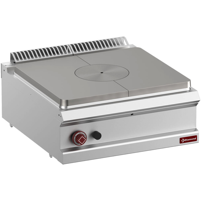 Plaque coup de feu en fonte (10 mm) avec anneau central amovible, chauffage gaz par un brûleur positionné au centre de la chambre de combustion. Chambre de combustion isolée thermiquement par de la laine de verre. Régulation par une vanne gaz, allumage par piézo-électrique et sécurité par thermocouple, accessibilité frontale permettant une maintenance très aisée.