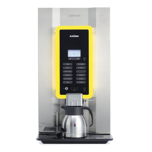 La gamme Optifresh NG. La machine au design bien particulier, caractéristique d’Animo. Pour produite un café filtre tout frais ou différentes variétés de cafés et de boissons chaudes par simple pression sur un bouton. Optifresh est simple à utiliser et facile d’entretien. Système Fresh Brew avec filtre permanent. Pas de changement de papier filtre. OptiFresh Bean: Moulin à café avec broyeur céramique. Convient pour tasses et pichets.Sortie d’eau chaude indépendante| Nombre de bac | 4 |