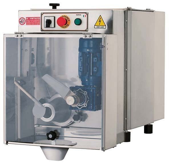 -Cette machine sert à diviser la pâte en portions selon les grammes choisis de 50 à 300 gr avec cône fixe à l’intérieur duquel on intervient à chaque fois avec des bagues de réduction pour obtenir avec une tolérance de ± 10% 5 classes de grammes: 50/90, 80/130, 120/180, 170/230, 220/300.