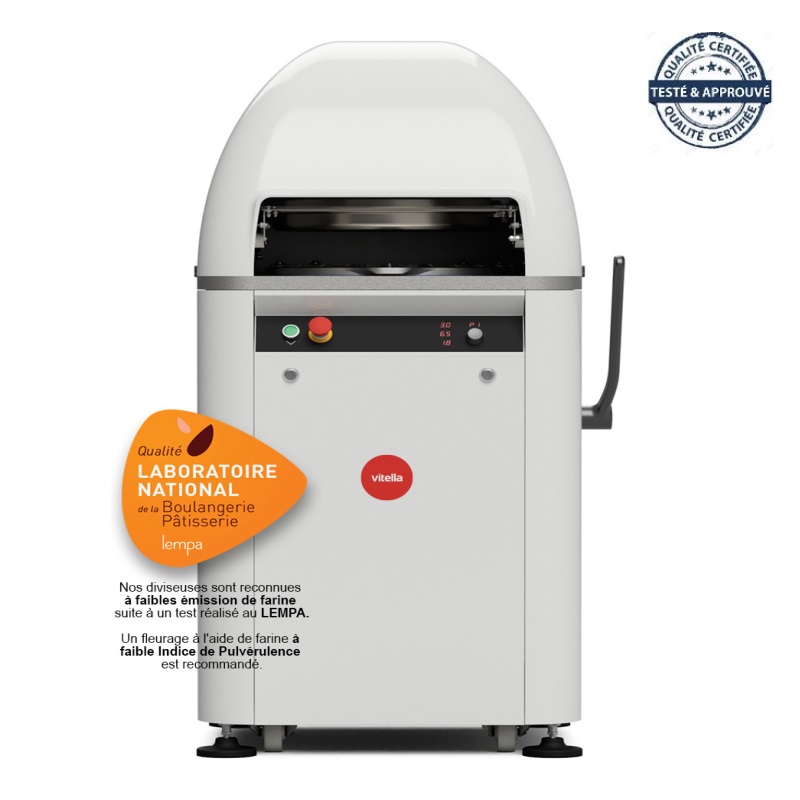 Faible Émission de Farine : Reconnue à faible émission de farine suite à un test réalisé au LEMPA, notre diviseuse bouleuse semi-automatique offre un environnement de travail plus sain. Un fleurage à l‘aide de farine à faible Indice de Pulvérulence est recommandé pour une utilisation optimale.