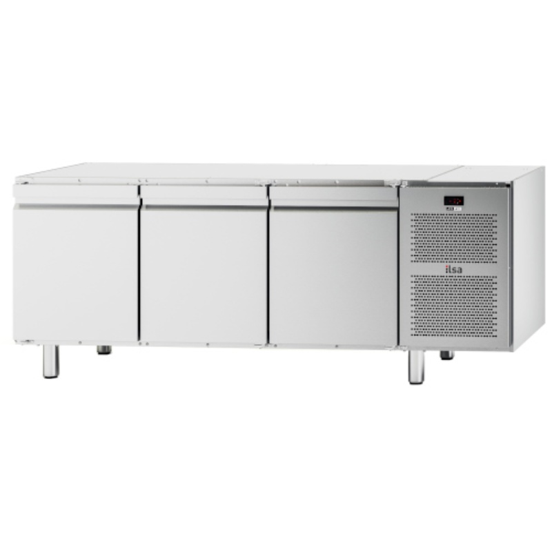 Les nouvelles tables réfrigérées NEOS sont construites avec une structure monocoque en acier inox AISI 304. Finition extérieure scotch-brite satinée ; épaisseur d'isolation de 60 mm pour le corps et de 50 mm pour les portes avec mousse à haute densité (40 kg/mc) ; dos extérieur en tôle galvanisée, en option dos en acier inox scotch-brite AISI 304 ; pieds en acier inox réglables en hauteur h. 140/230 mm ; chambre froide avec coins arrondis pour un meilleur nettoyage intérieur ; portes à fermeture automatique avec arrêt à 95° ; joints magnétiques des portes et des tiroirs facilement échangeables ; dégivrage au gaz chaud et évaporation automatique de l'eau de condensation ; poignées ergonomiques ; compartiment technique à gauche en option pour les deux versions ; alimentation électrique standard 230V/50Hz ; gaz réfrigérant R290 ; charnières supérieures et inférieures des portes fixées à l'avant du corps (interchangeables sans devoir démonter le plan de travail) ; portes réversibles.