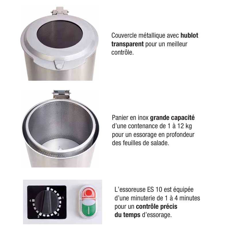- Panier en inox : Conçu pour une grande capacité de 1 à 12 kg, il assure un essorage en profondeur, idéal pour les restaurants, cantines et autres établissements servant de grandes quantités de légumes.