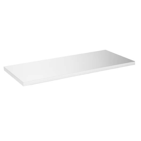 La tablette supérieure est en inox avec des bords tombants de 40 mm et retours de 15 mm, renforcée par de l’aggloméré stratifié blanc de 18 mm. Les profilés longitudinaux pré-percés sont soudés sur la tablette supérieure. La tablette inférieure est en inox avec des bords tombants de 40 mm et retours de 15 mm, renforcée par un oméga en inox sur toute la longueur, elle est clipsée sur les deux tubes latéraux de 20x20 mm. Les pieds sont en tubes carrés de 40 mm pré-percés, reliés latéralement entre eux par des profilés en inox, à 200 mm du sol, renforcés par des tubes inox de 20x20 mm posés sur des embouts réglables de 65 mm en inox.