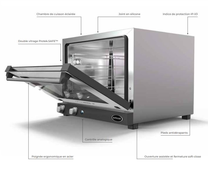 -L’air est l’instrument de transmission de la chaleur et donc le moyen de cuire le produit. Les performances de ventilation sont fondamentales pour obtenir des cuissons uniformes sur tous les points de chaque plat à four, sur tous les plats à four. C’est pour cette raison que l’étude des écoulements d’air à l’intérieur de la chambre de cuisson joue dans la conception de tous les fours CALDOBAKE un rôle de première importance. -La technologie Protek.SAFE fait partie du programme NON.STOP EFFORTS avec lequel SPIDOCOOK s’engage à réduire au minimum l’impact environnemental de ses produits et des processus de cuisson avec lesquels ils sont réalisés.