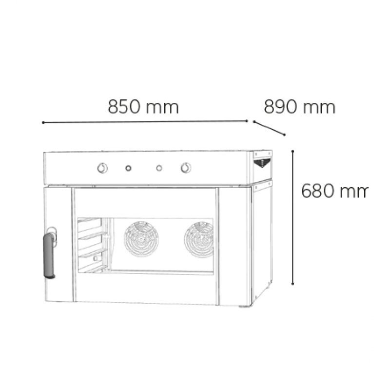Avec des dimensions de 800 x 890 x 680 mm et une capacité de 4 plaques 400 x 600, ce four s’adapte parfaitement aux environnements professionnels exigeants. Sa puissance de 6,5 kW et son alimentation en 220V assurent une montée rapide en température, idéale pour une productivité optimale.