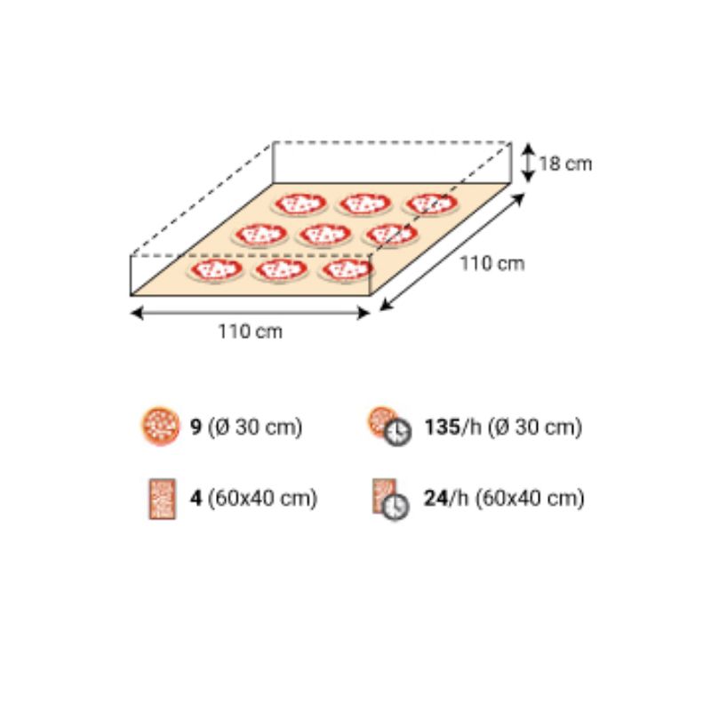 Ce four à pizza de 1 chambre, d'une taille compacte de 1470x1230x790 mm, est conçu pour répondre aux exigences des pizzerias et restaurants à fort trafic. Avec une capacité de 9 pizzas de 30 cm, il est capable de produire jusqu’à 135 pizzas par heure, vous garantissant une cuisson rapide et efficace. Grâce à son système de chauffe à gaz (24.950 kcal) et sa température maximale de 350°C, il offre une cuisson homogène et rapide pour une texture parfaite de la pâte et une garniture savoureuse. Sa puissance de 29 kW assure des performances constantes et fiables, même pendant les périodes de forte demande.