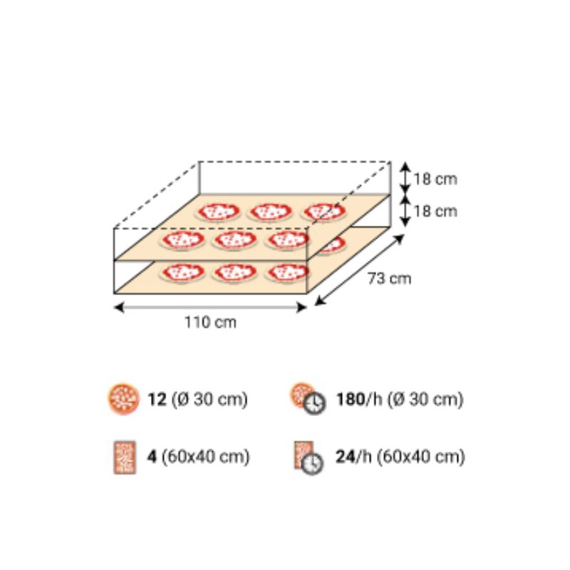 Équipé d’une puissance de 43 kW et d'une alimentation au gaz avec une capacité de 37 000 kcal, ce four assure une performance énergétique optimale. Son design robuste et ses matériaux de haute qualité garantissent une durabilité exceptionnelle, même dans les environnements de travail les plus exigeants. Avec une tension de 400V, ce four combine puissance et efficacité pour une cuisson parfaite de vos pizzas.