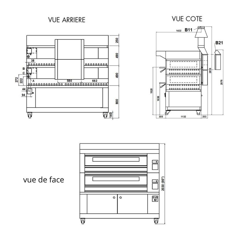 Ses dimensions extérieures (2000x1340x1280 mm) et intérieures (2x1470x850x180 mm) permettent une intégration facile dans des espaces de cuisine professionnels de taille variable. Ce four est également conçu pour une puissance de 62,0 kW, avec une alimentation en gaz générant 53 340 kcal, garantissant une performance de cuisson optimale, même en période de forte demande.