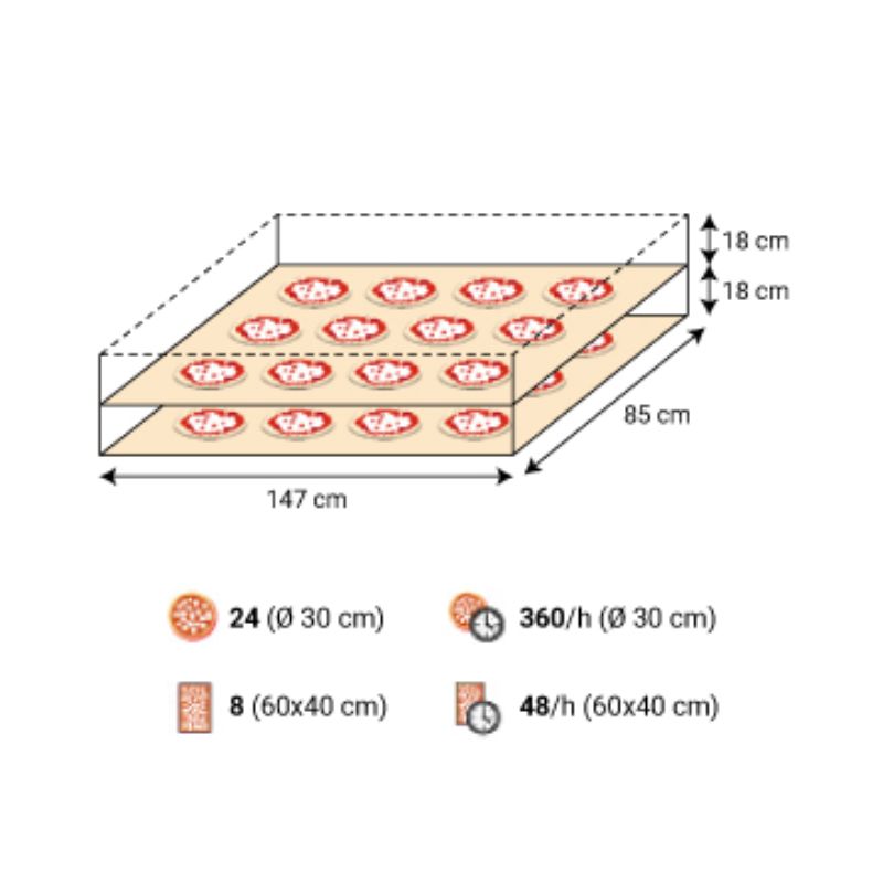 Avec une capacité impressionnante de 24 pizzas de 30 cm, ce four à gaz est l'outil parfait pour augmenter votre productivité tout en conservant un haut niveau de qualité de cuisson. Doté d’une température maximale de 350°C, il offre une chaleur constante et homogène, assurant ainsi une cuisson rapide et parfaite de vos pizzas. Sa production de 360 pizzas par heure fait de ce four un allié indispensable pour les établissements à fort trafic.
