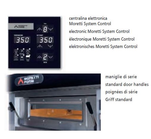 -Chaque four série P est équipé de l’exclusive partie électronique Moretti System Control avec réglage séparé de la quantité de chaleur pour ciel et plan de cuisson, temporisateur d’allumage et fonction Economie*.