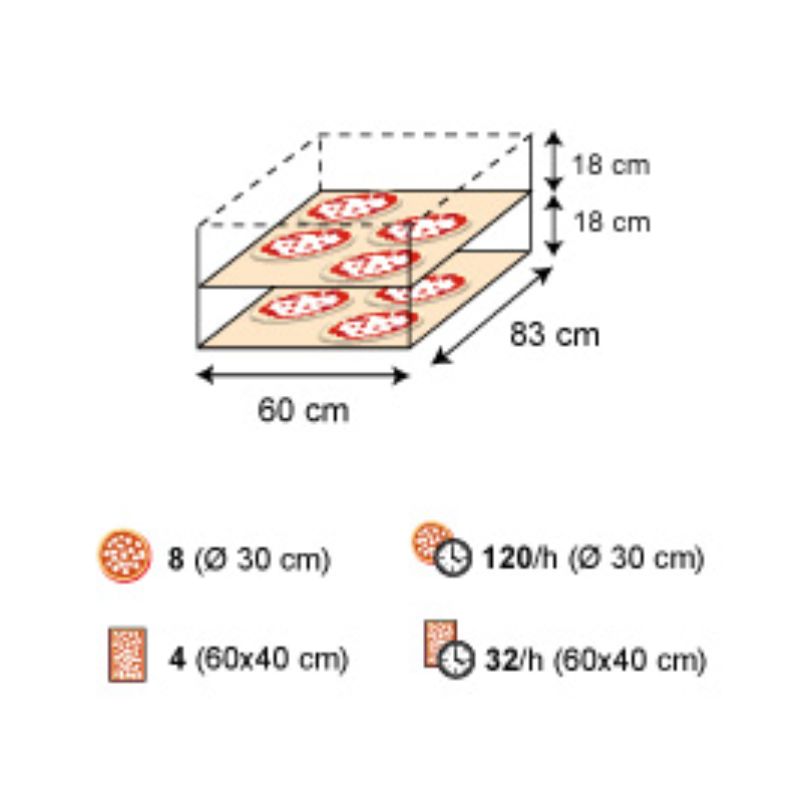 Avec un poids de 303 kg, cet appareil est robuste et fiable, offrant une longévité exceptionnelle dans les conditions les plus difficiles. Il est également facile à entretenir et à nettoyer, vous permettant de vous concentrer sur ce qui compte le plus : la préparation de pizzas de qualité. Ce four vous permettra de booster votre productivité et de satisfaire vos clients avec des pizzas cuites à la perfection à chaque fois.