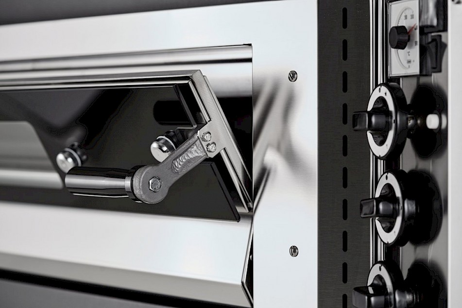 • La conformation spéciale de la chambre de cuisson (en acier inox) et du système chauffant permet de superposer jusqu’à deux chambres; les brûleurs se trouvent au-dessous du plan de cuisson en pierre réfractaire de la platée et les deux brûleurs proches des parois latérales sont orientés d’un angle spécifique, afin que la chaleur soit acheminée vers le ciel de la chambre, qui va le réfléchir par irradiation vers le produit à cuire