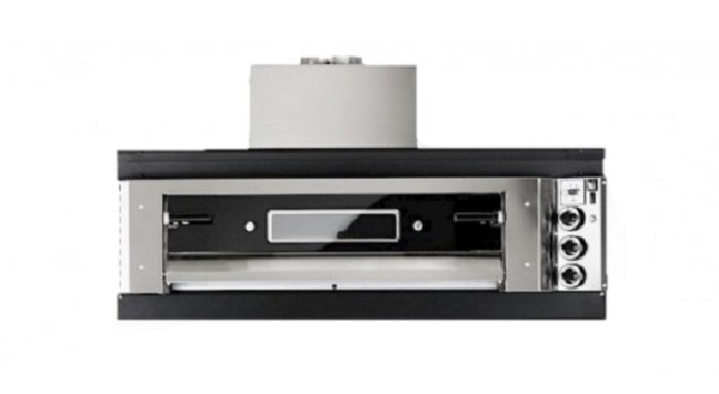 • La conformation spéciale de la chambre de cuisson (en acier inox) et du système chauffant permet de superposer jusqu’à deux chambres; les brûleurs se trouvent au-dessous du plan de cuisson en pierre réfractaire de la platée et les deux brûleurs proches des parois latérales sont orientés d’un angle spécifique, afin que la chaleur soit acheminée vers le ciel de la chambre, qui va le réfléchir par irradiation vers le produit à cuire