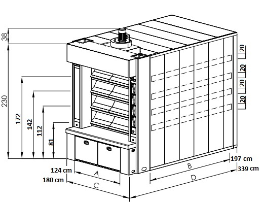 Les portes des chambres de cuisson sont en verre trempé auto-équilibré. Sur demande, il est possible d'ouvrir les portes vers le haut.