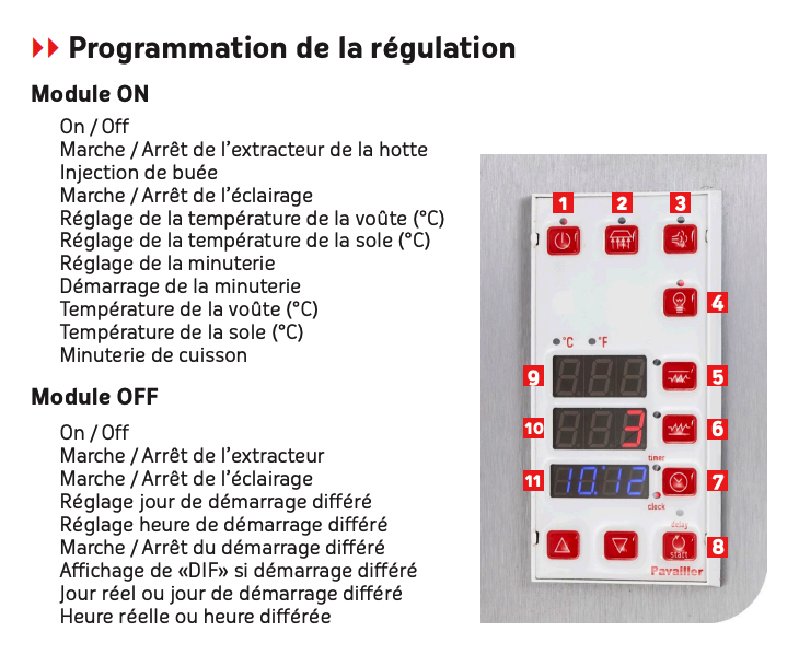 -Les opérations courantes, telles que la modification et la visualisation des températures des soles et des voûtes, sont immédiatement accessibles et faciles à programmer. Et ce, grâce à un système innovant d’horloge en temps réel avec démarrage programmable, permettant une gestion efficace pour la cuisson différée.