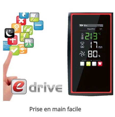 - La commande eDrive est un écran tactile de 60x100mm (4,5’’) intégré dans la façade du four. Elle permet de traiter 100 programme:1 programme manuel ,3 programmes de cuisson continue,96 programmes avec 6 phases